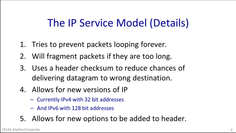 - a checksum is calculated over the whole header so just in case the header is corrupted, we are not likely to deliver a packet to the wrong desination by mistake.