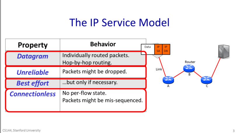 - IP is an extremely simple, minimal service. It maintains no state at all related to a communication. We say that a communication service is “connectionless” because it doesn’t start by establishing some end to state associated with the communication. In other words, when we make a Skype call lasting several minutes and consisting of many IP datagrams, the IP layer maintains no knowledge of the call, and simply routes each datagram individually and independently of all the others.