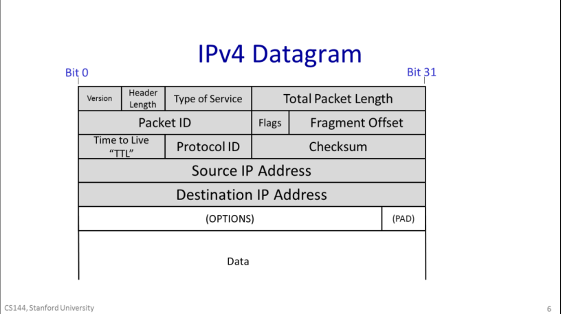 - The Protocol ID, that tells us what is inside the data field. Essentially, it allows the destination end host to demultiplex arriving packets, sending them to the correct code to process the packet. If the Protocol ID has the value “6” then it tells us the data contains a TCP Segment, and so we can safely pass the datagram to the TCP code and it will be able to parse the segment correctly. The Internet Assigned Numbers Authority (IANA) defines over 140 different values of Protocol ID, representing different transport protocols.