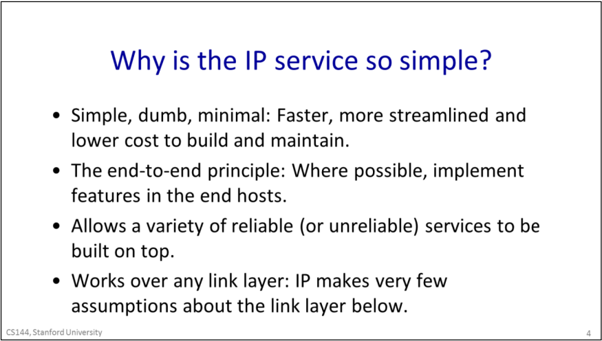 - Works over any link layer: IP makes very few assumptions about the link layer. IP makes very little expectation of the Link layer below – the link could be wired r wireless, and requires no retransmission or control of congestion.