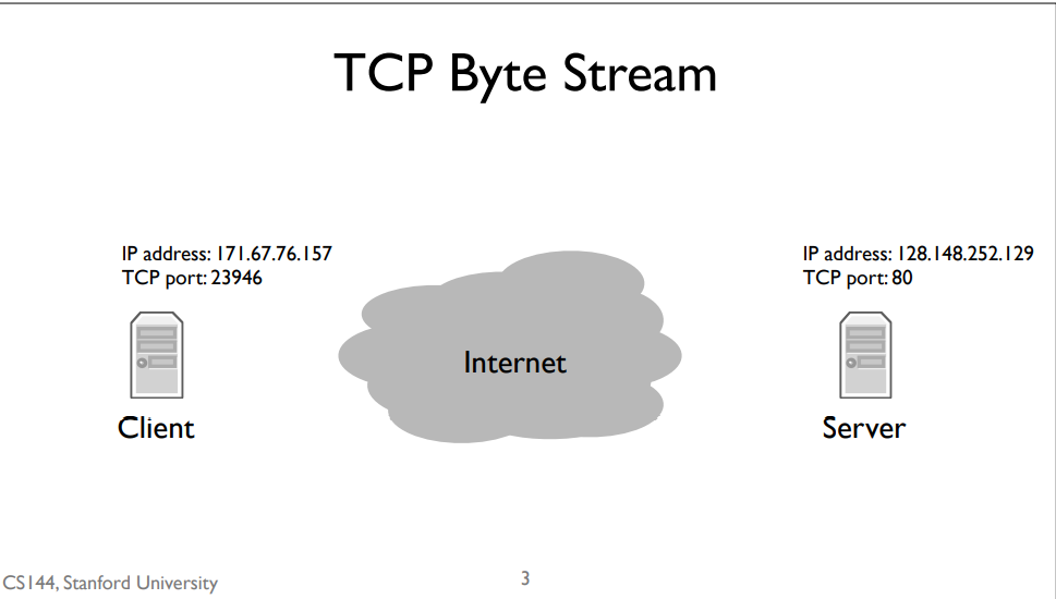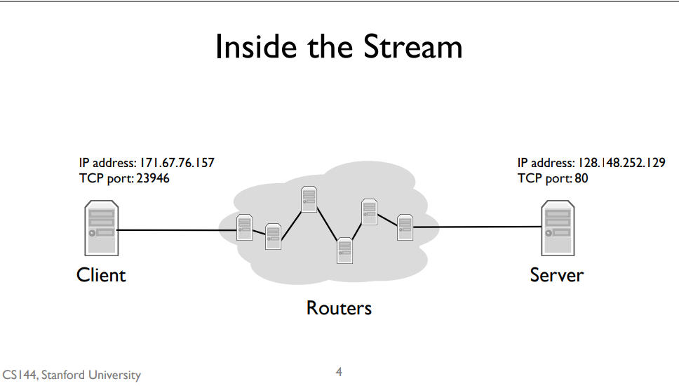 Recall that the network layer is responsible for delivering packets to computers, but the transport layer is responsible for delivering data to applications. From the perspective of the network layer, packets sent to different applications on the same computer look the same. This means that to open a TCP stream to another program, we need two addresses. The first, an Internet Protocol address,is the address the network layer uses to deliver packets to the computer. The second, the TCP port, tells the computer’s software which application to deliver data to. Web servers usually run on TCP port 80. So when we open a connection to a web server, we send IP packets to the computer running the web server whose destination address is that computer’s IP address. Those IP packets have TCP segments whose destination port is 80.