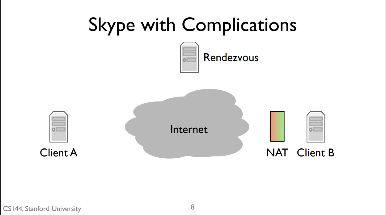 simple mode:It does so using something called a rendezvous server. When you log into Skype, your client opens connections to a network of control servers. In this case, client B opens a connection to the rendezvous server. This works fine because the server isn’t behind a NAT and client B can open connections out without any problems. When client A calls client B, it sends a message to the rendezvous server. Since the server has an open connection to client B, it tells B that there’s a call request from A. The call dialog pops up on client B. If client B accepts the call, then it opens a connection to client A. Client A was trying to open a connection to client B, but since B was behind a NAT, it couldn’t. So instead it sends a message to a computer that client B is already connected to, which then asks client B to open a connection back to client A. Since client A isn’t behind a NAT, this connection can open normally. This is called a reverse connection because it reverses the expected direction for initiating the connection. Client A is trying to connect to client B, but instead client B opens a connection to client A.