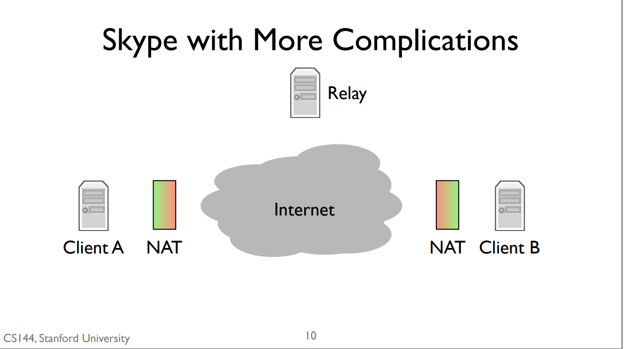 simple model: Skype introduces a second kind of server, called a relay. Relays can’t be behind NATs. If both client A and client B are behind NATs, then the communicate through a relay. They both open connections to the relay. When client A sends data, the relay forwards it to client B through the connection that B opened. Similarly, when client B sends data, the relay forwards it to client A through the connection client A opened.