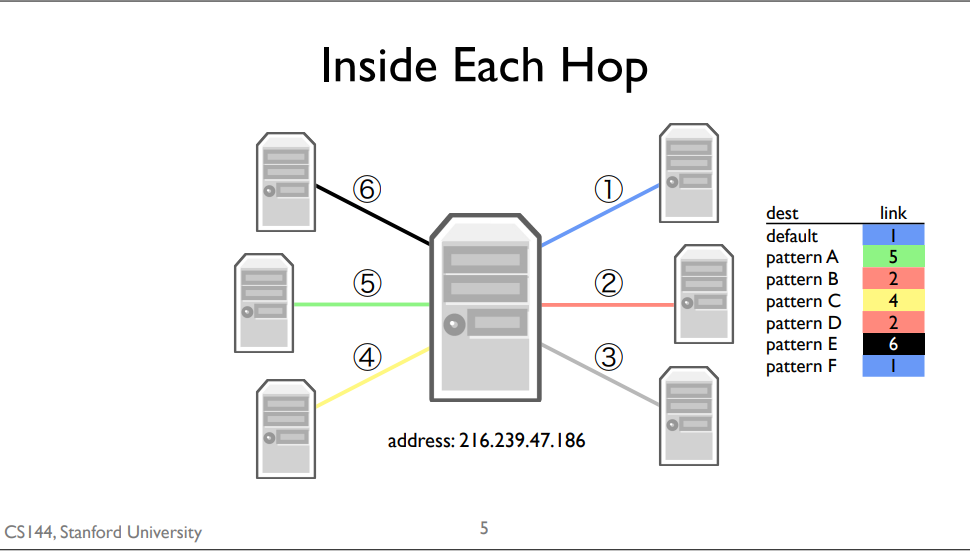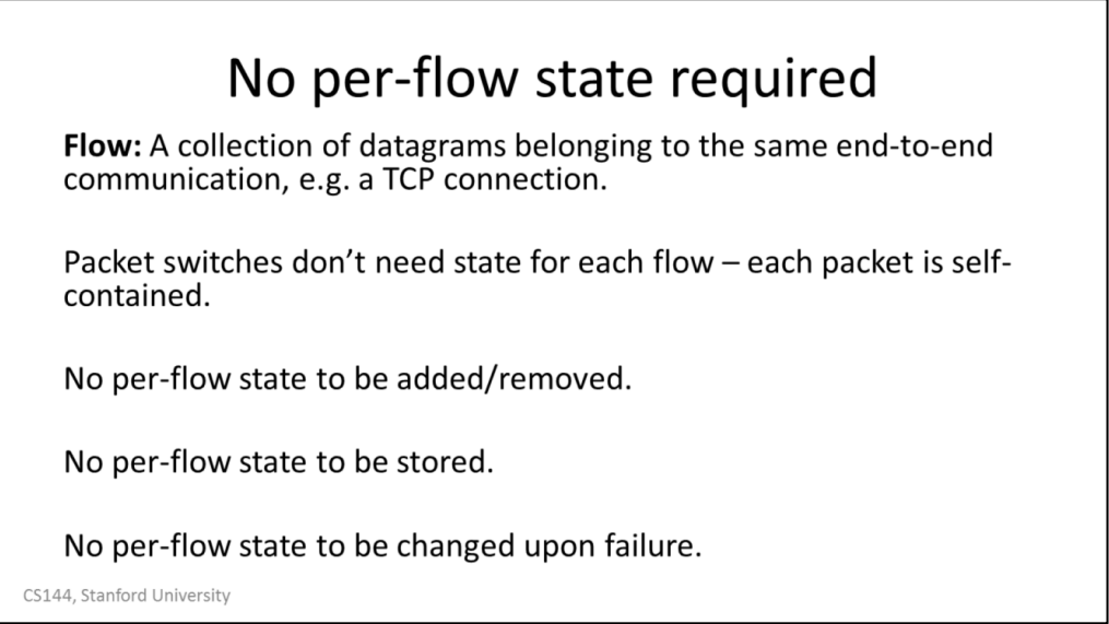 The switch doesn’t need to worry about adding or removing this per-flow state. Imagine if every time you wanted to load a web page, you had to communicate with every switch along the path to set up state so your request would work. This could make things much slower. Instead, you can just send packets and the switches forward them appropriately.